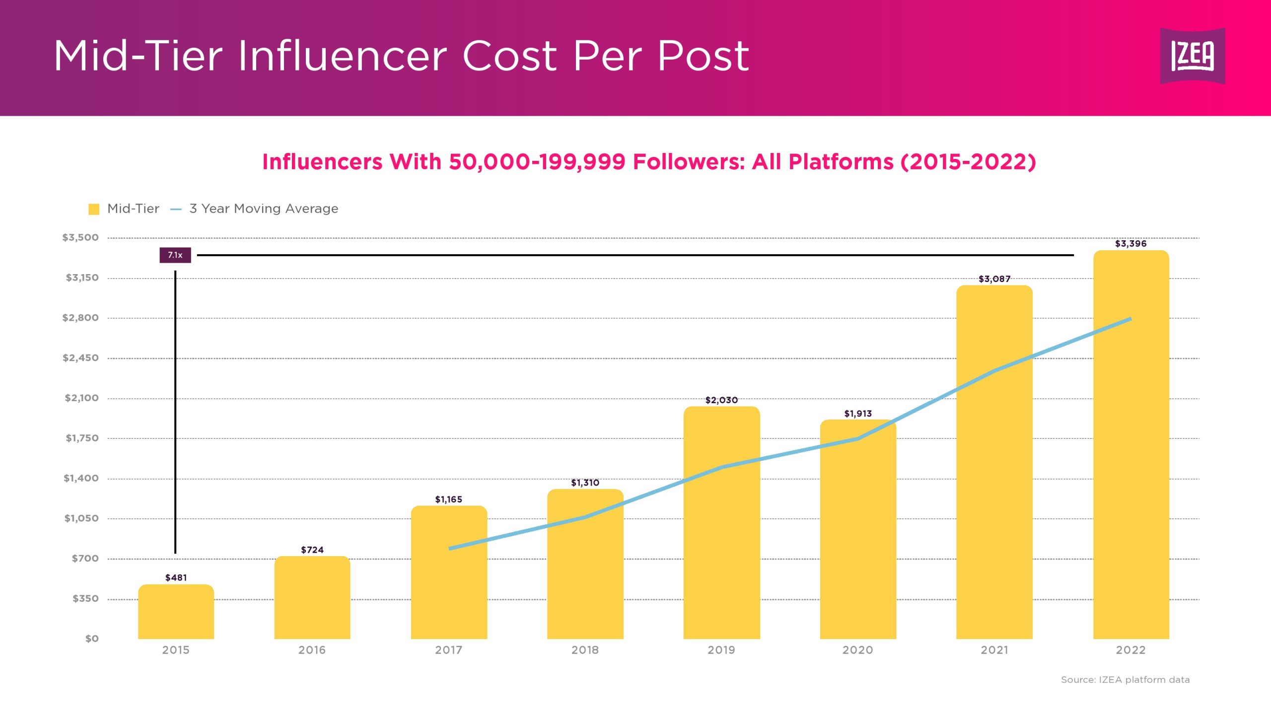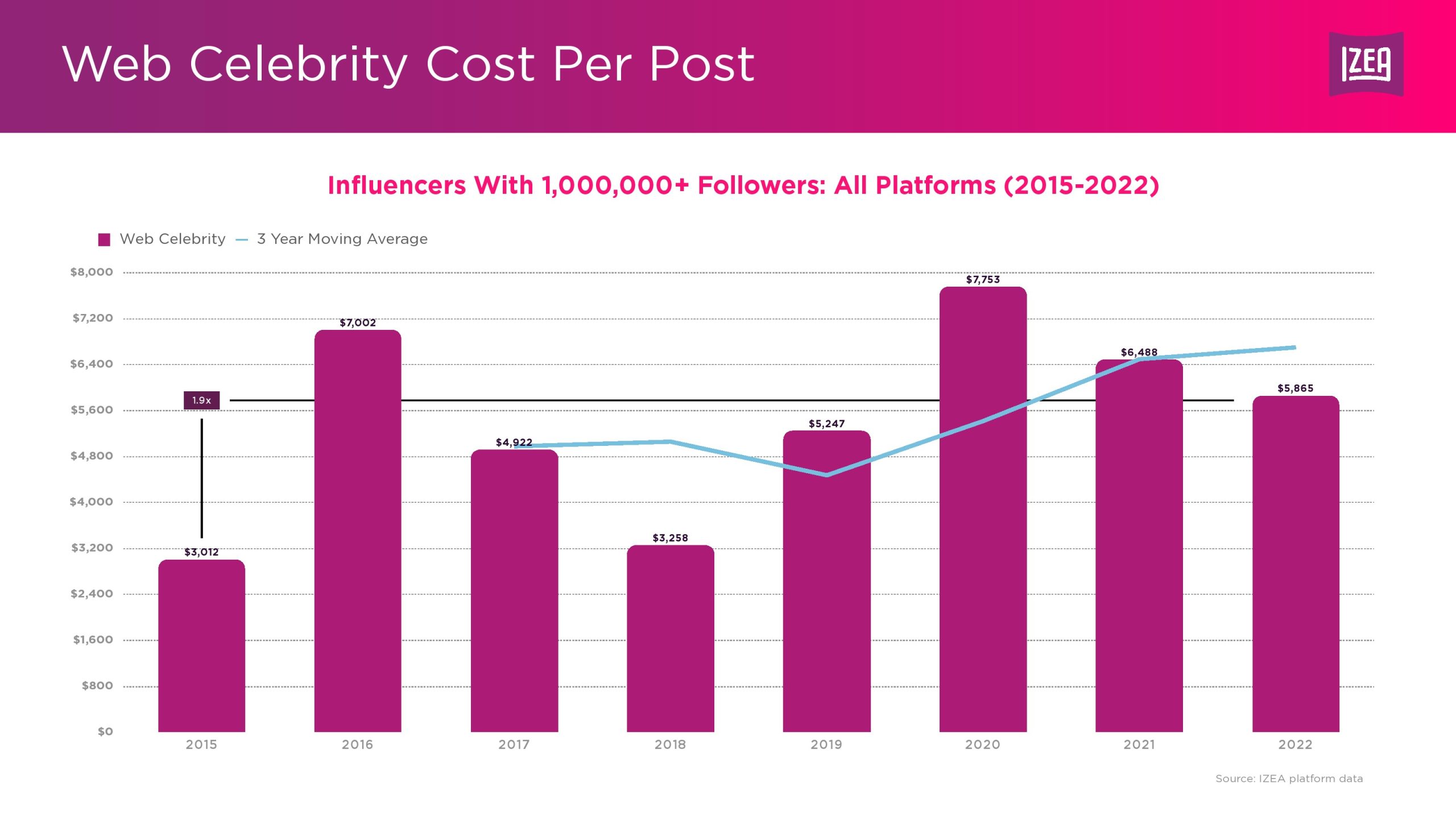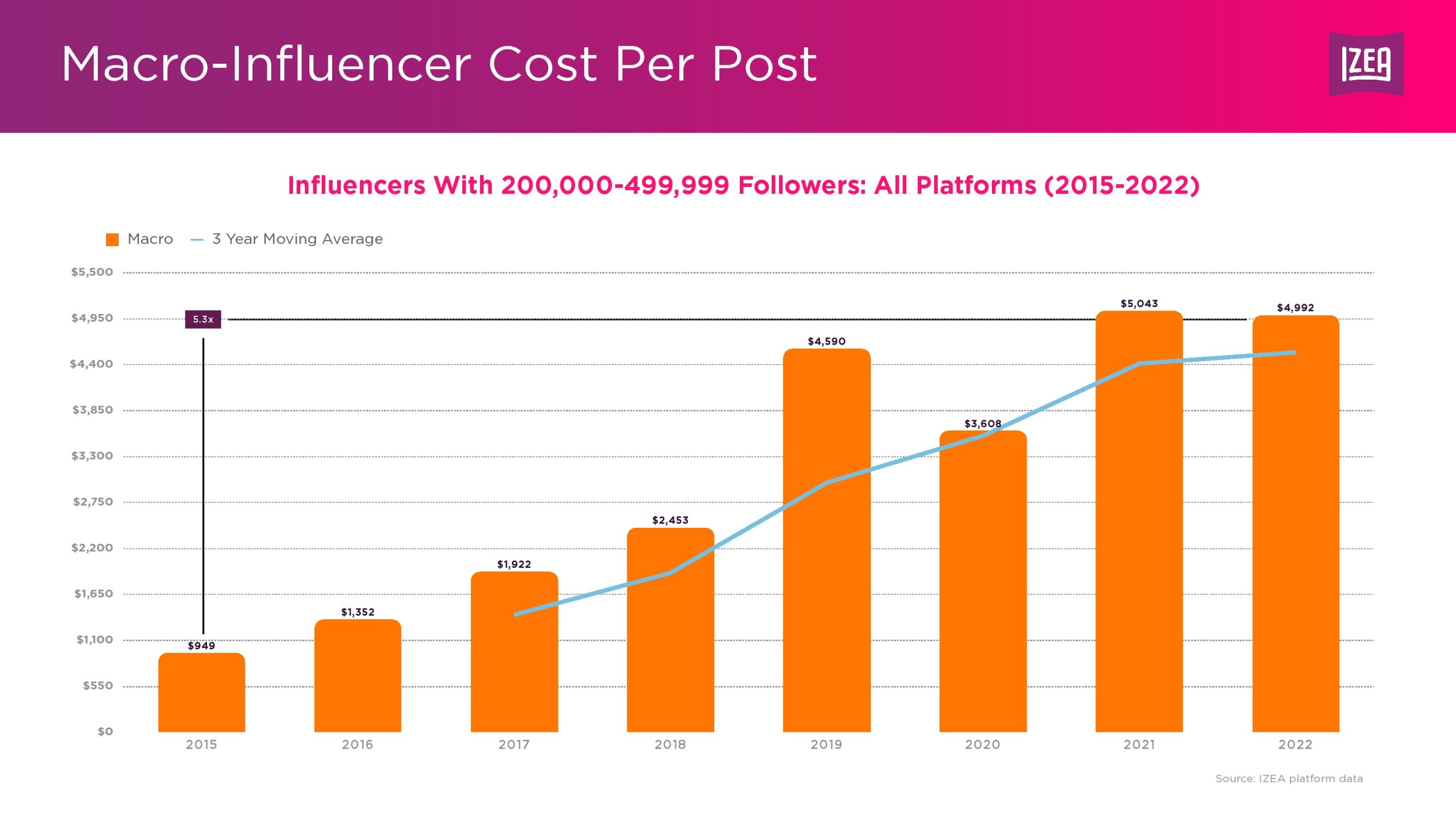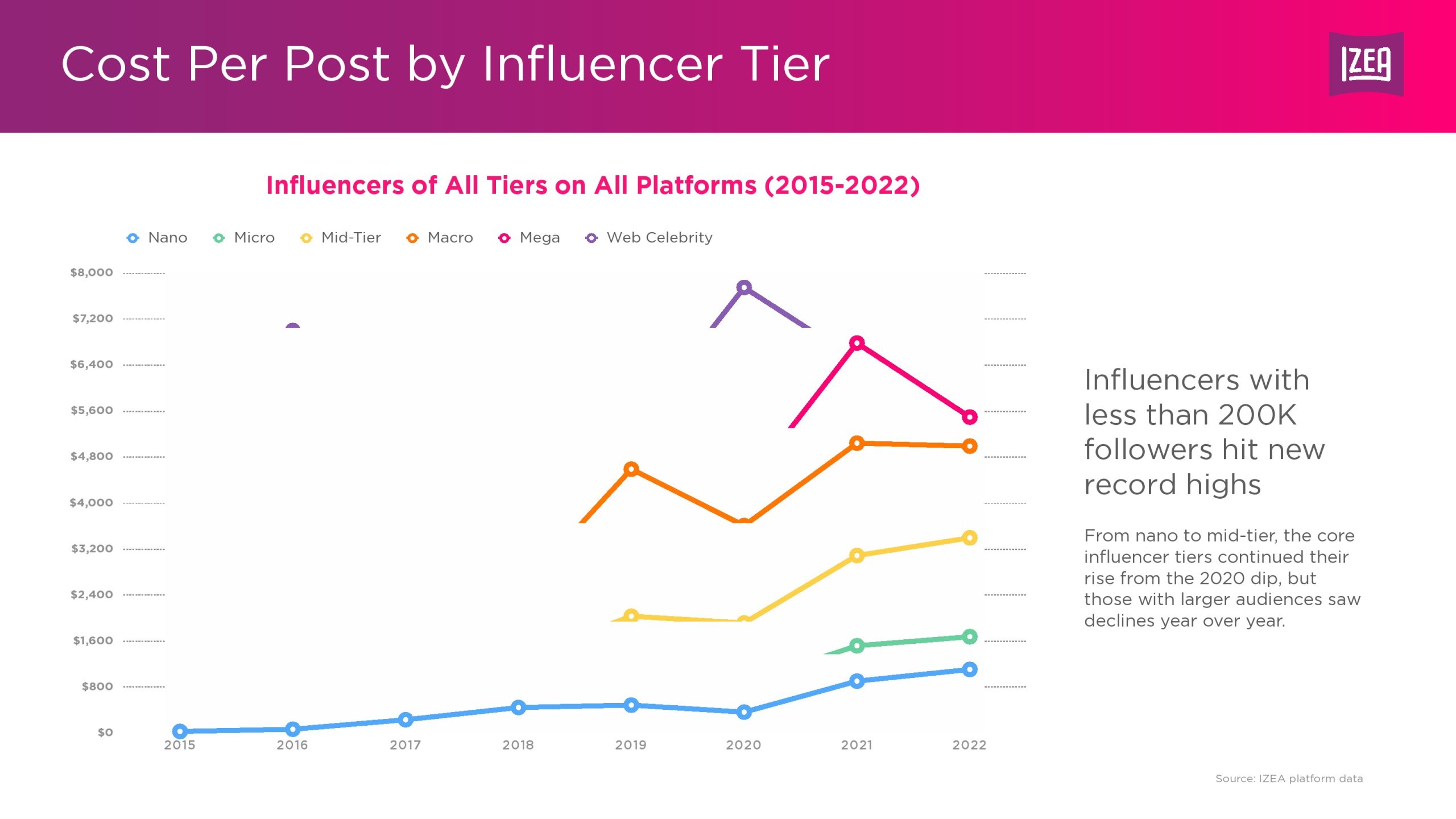 为全球领先品牌提供网红营销技术、数据和服务的领先供应商IZEA 发布了第二份网红收入报告。随着营销人员在2022年扩大了网红营销支出,纳米级、微型和中型网红的每篇帖子的平均成本创下了历史新高。