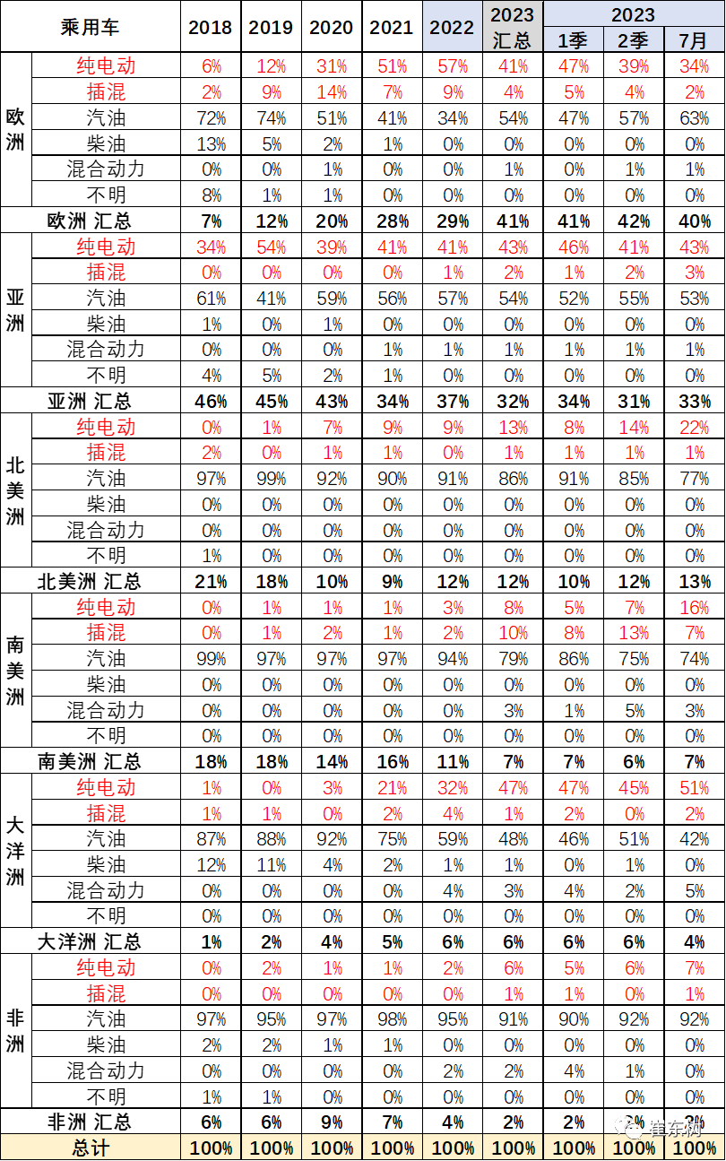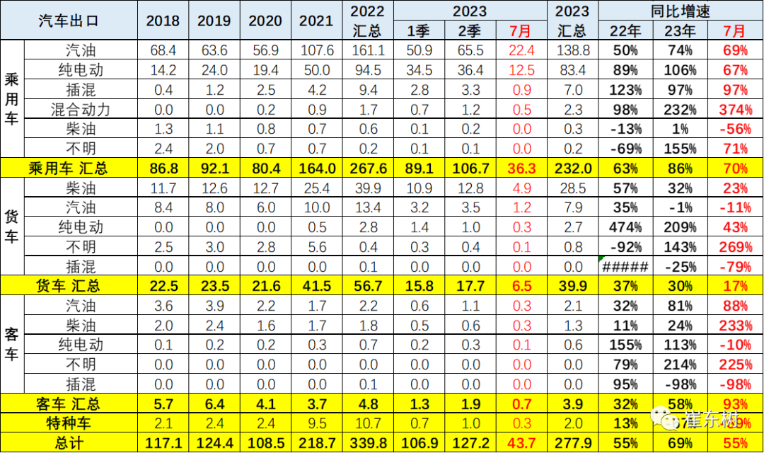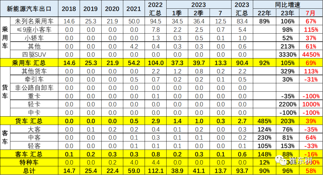 2021-2022年初,随着汽车独资企业的出口,中国汽车出口欧洲发达国家市场取得巨大突破。新能源车是中国汽车出口的核心增长点,改变了依赖亚洲和非洲等部分穷国和不规范国家的汽车出口被动局面。2020年新能源车出口22.4万,表现好;2021年新能源车出口59万台,继续持续走强;2022年累计出口新能源车112万台;2023年1-7月出口新能源车94万台,同比增长96%;其中2023年新能源乘用车出口90万台,同比增长105%,占比新能源汽车出口96%。