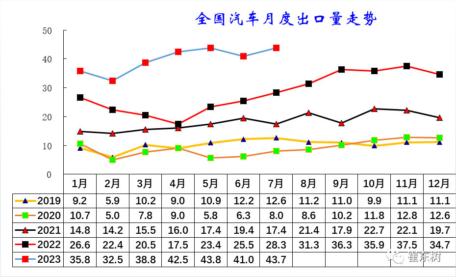 2023年7月中国汽车出口达到43.8万台,7月出口继续保持历史高位的走势。由于2022年的上海恢复带来的高基数,今年7月的出口增长超过55%,因此中国汽车出口暴增的局面已经持续出现。