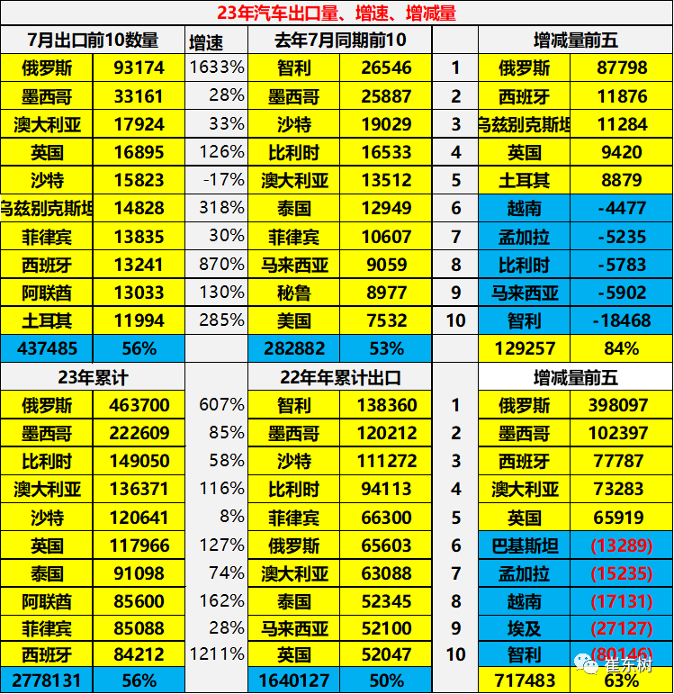 中国乘用车2023年1-7月出口主要下滑市场是埃及、智利、巴基斯坦等经济不发达国家。