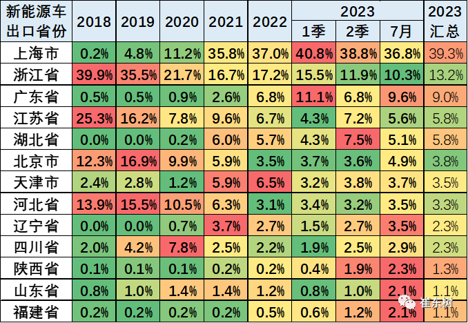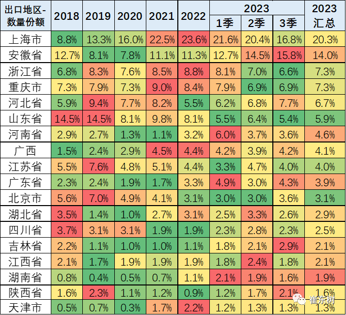 随着特斯拉进入中国,中国汽车出口格局改变。2023年新能源汽车出口比较强的地区是上海、浙江、广东、江苏、湖北等。
