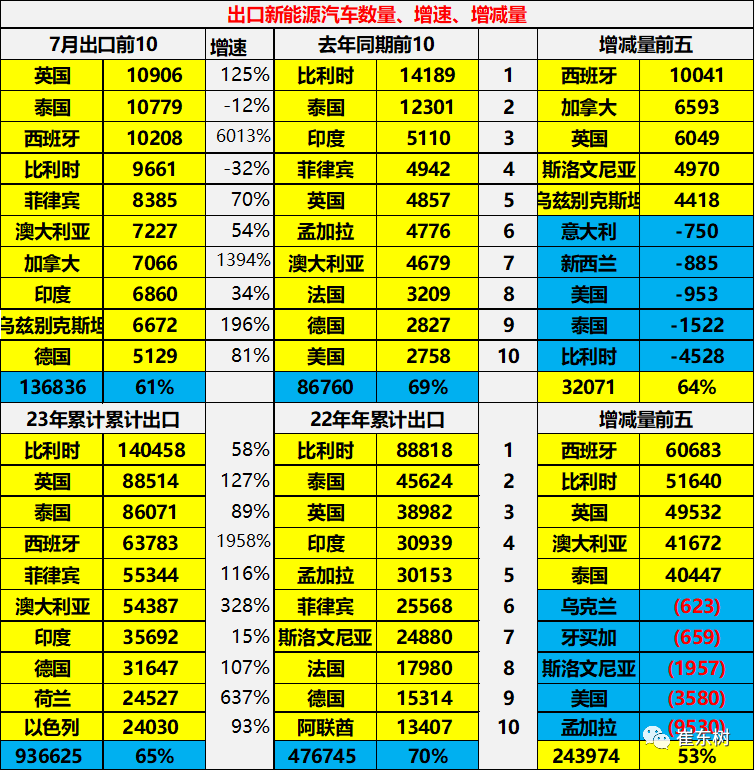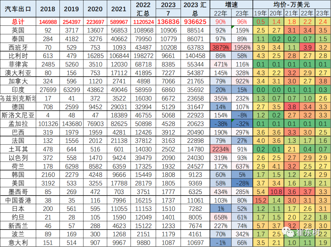 2023年1-7月中国新能源乘用车出口94万台,达到96%的强势增长。全年对欧洲国家的新能源车出口表现很强,对印度、孟加拉、菲律宾的出口走势分化,但均价均很低。