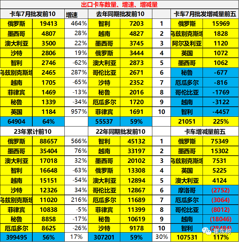 2023年1-7月的俄罗斯、墨西哥的卡车出口较强;智利、越南的卡车出口下降。