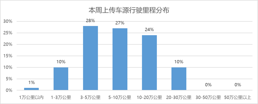 从上传车源行驶里程数据来看,本周上传数据中,5万公里以内的“较新车”数据、5-10万公里的“性价比”车源数据及10万公里以上的车源数据均与上周保持一致。