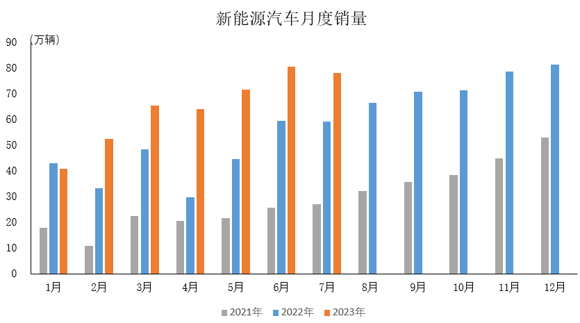2023年7月,新能源汽车产销分别完成80.5万辆和78万辆,同比分别增长30.6%和31.6%,市场占有率达到32.7%。