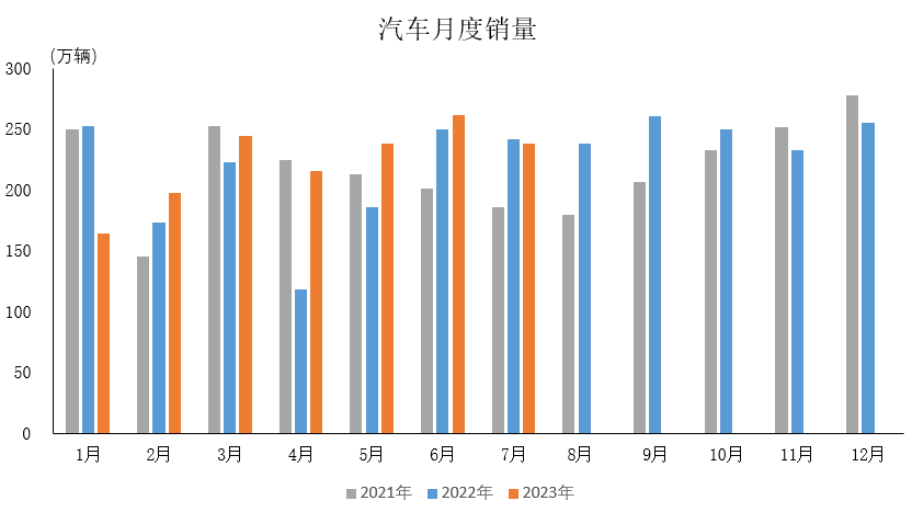 2023年7月,汽车产销分别完成240.1万辆和238.7万辆,环比分别下降6.2%和9%,同比分别下降2.2%和1.4%。