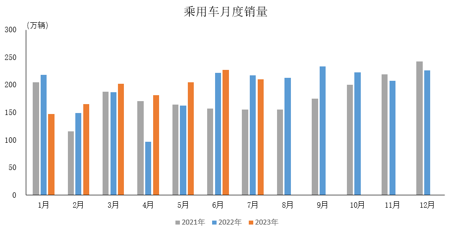 2023年7月,乘用车产销分别完成211.5万辆和210万辆,环比分别下降4.7%和7.4%,同比分别下降4.3%和3.4%。