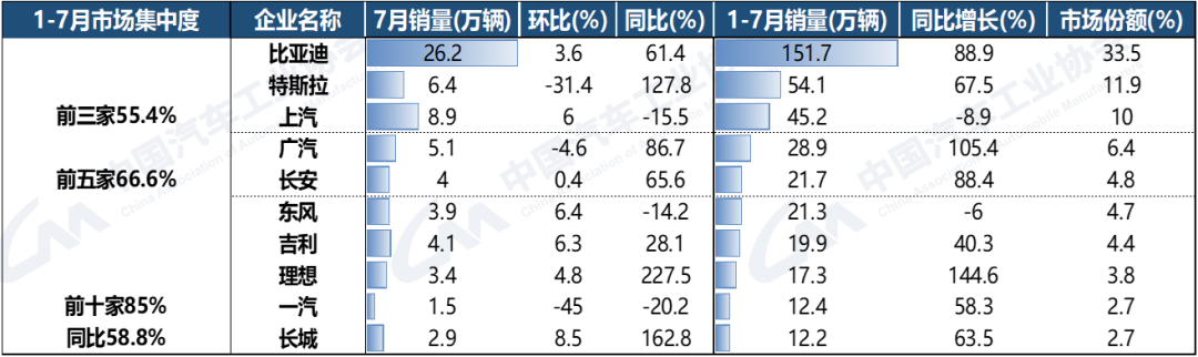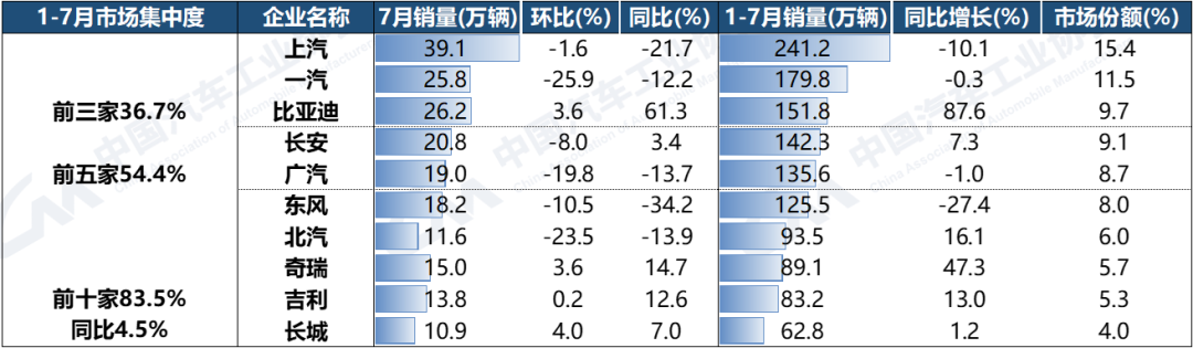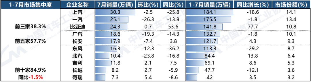 据中国汽车工业协会统计分析,2023年1-7月,汽车销量排名前十位的企业(集团)销量合计为1304.8万辆,同比增长4.5%,占汽车销售总量的83.5%,低于上年同期2.8个百分点。