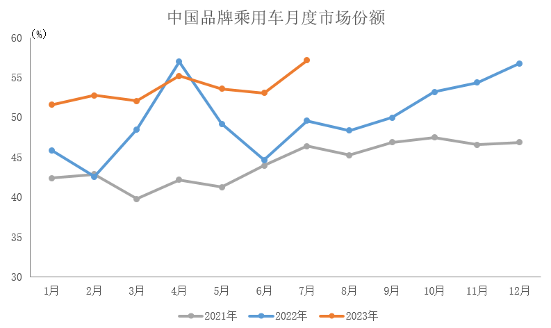据中国汽车工业协会统计分析,2023年7月,中国乘用车市场份额快速增长。