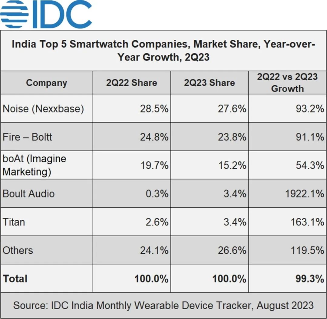 Noise(Nexxbase)在整体可穿戴设备市场中排名第二,同比增长61.6%,市场份额为13.5%。Noise以27.6%的份额重新夺回智能手表的第一位置,同比增长93.2%。在TWS品类中,它以6.6%的份额进一步上升至第四位,同比增长26.3%。Noise Colorfit Icon 2,Colorfit Icon Buzz和Colorfit Pulse Go Buzz贡献了其出货量的39.0%。