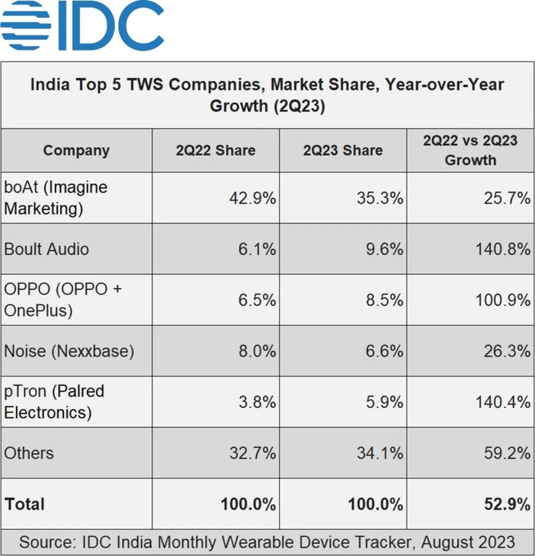 Boult Audio以6.6%的份额和176.9%的同比增长排名第五。在TWS品类中排名第二,份额为9.6%,同比增长140.8%。它在智能手表类别中以1922.1%的高增长率和3.4%的份额排名第四。其Drift,Drift Plus和Striker为其智能手表出货量贡献了59.4%。