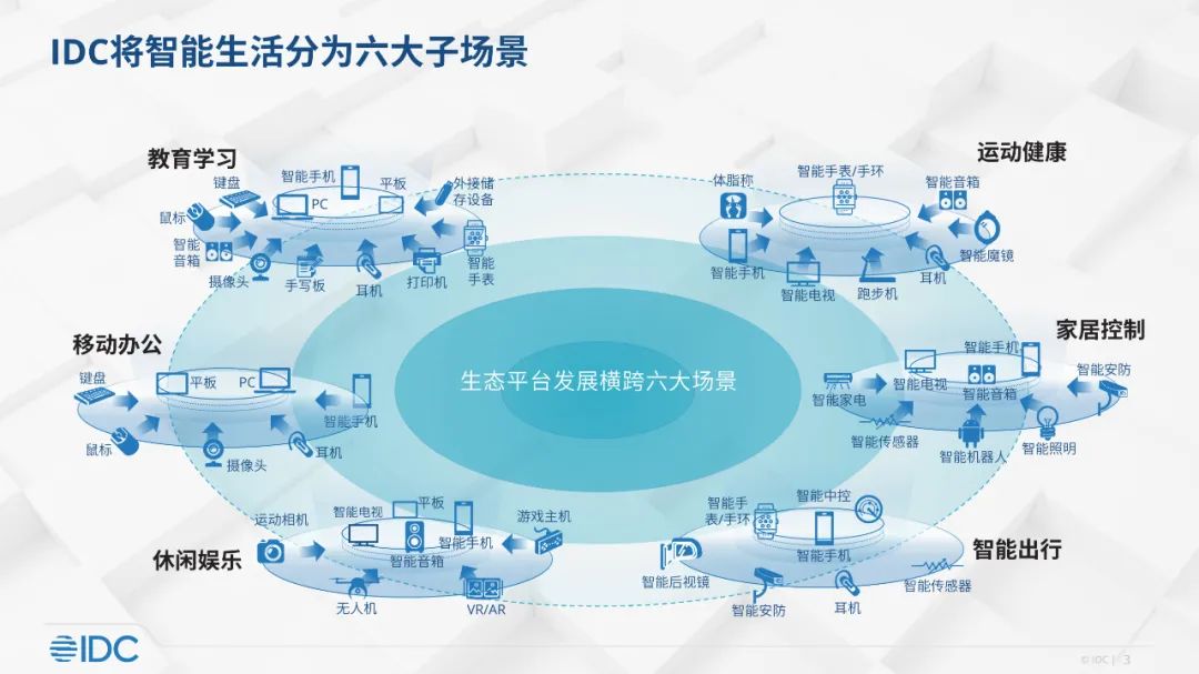 基于此,为了更好地理解智能终端设备,IDC将围绕智能终端的使用场景分为六大智能生活场景,分别是休闲娱乐、移动办公、教育学习、运动健康、家居控制和智慧出行。