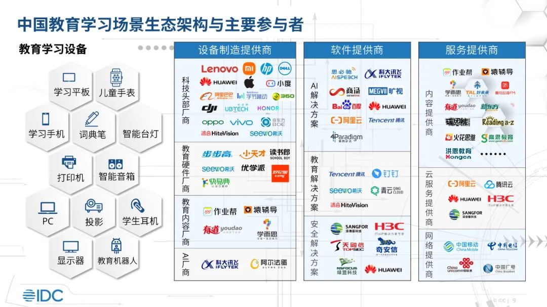 教育学习场景生态架构中,不仅有众多硬件制造商参与,也包含了多种类型的软件和服务提供商,例如AI解决方案提供商和云服务提供商等。