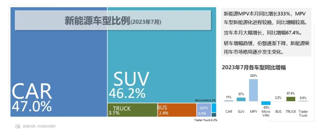 - 2023年7月,新能源SUV占比46.2%,份额同比提升7.5个百分点。新能源MPV本月同比增长333%,MPV车型新能源化进程较晚,同比增幅较高。轿车增幅趋缓,份额逐渐下降,新能源乘用车市场格局正逐步发生变化。