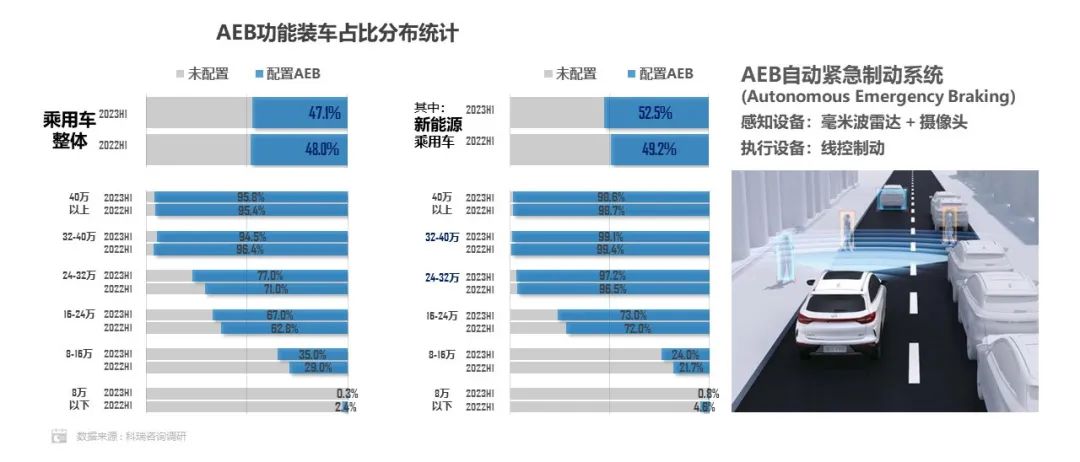 AEB作为重要的主动安全功能,在23年上市的大多新车中已实现全系标配,16万以上的乘用车型对于AEB功能的普及率已达到67%。在新能源领域,AEB功能的装配率继续提升,但大范围装车的价位段依然保持在16万元以上。16万以下的新能源车碍于造车成本压力,对于辅助功能的装配整体落后于燃油车。