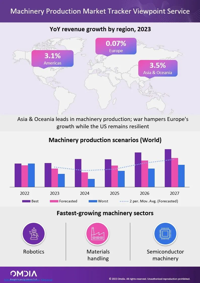 根据 2023 年第二季度报告,全球机械生产市场的收入继续呈上升趋势,2023 年将增长 2.5%。这一增长率虽然为正,但与 2022 年的增速相比有所放缓。