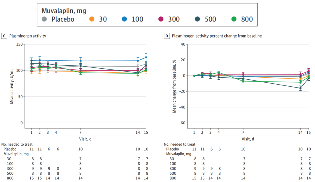 检测结果显示,止血功能指标以及纤溶酶原活性在高剂量下有轻微变化(500mg剂量时最多降低约14%),但在停药后恢复到基线。