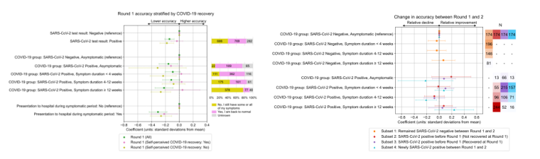 该研究进一步运用关联模型分析了持续的新冠症状在认知缺陷中的作用。首先通过询问参与者:是否感觉自己已从最后一次感染中恢复正常。按回答:是或否。将患者分为两类进行调查评估。结果发现,只在否定回答的人群中才能检测到认知缺陷,即感染新冠且感觉自己还未完全恢复的人群。而回答是,即完全恢复的人群则没有发现认知缺陷。这就表明持续的新冠症状对认知能力有一定影响,且症状持续时间越长,其影响越大。