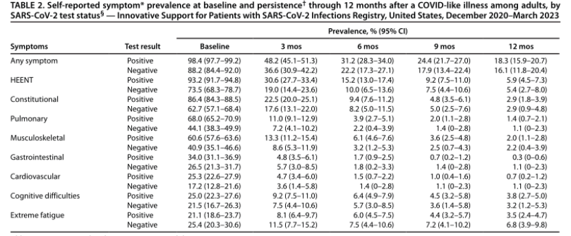 在前3个月的随访期间,所有相关症状都大幅下降,例如HEENT(头痛、流鼻涕、嗅觉丧失、味觉丧失、喉咙痛和脱发)、认知困难(健忘/记忆问题、思维困难、或注意力难以集中)和极度疲劳(疲劳严重程度评分≥25)。在新冠检测结果阳性的人中,症状从98.4%降至48.2%,在检测结果阴性的人中,从88.2%降至36.6%,如下表。