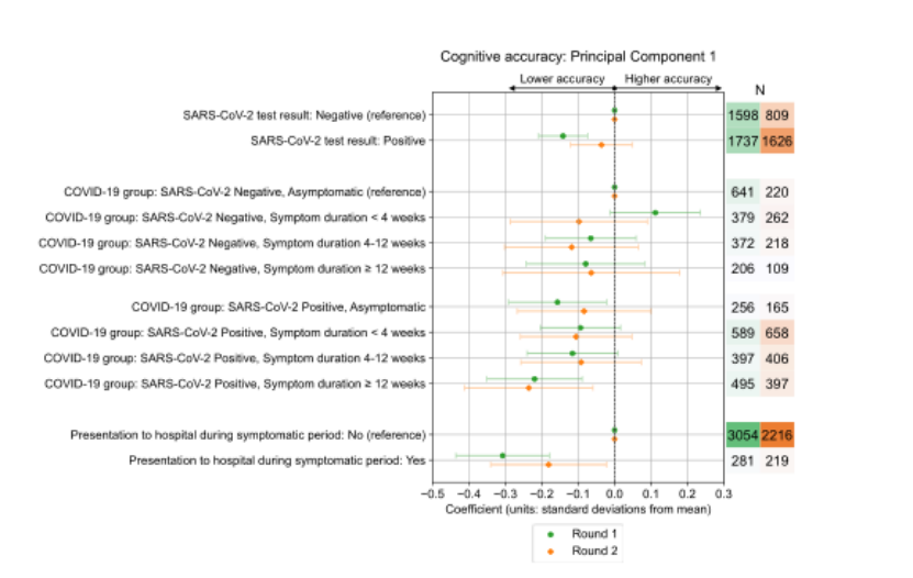 该研究对英国2021年7月12日至2021年8月27日(第一轮)和2022年4月28日至2022年6月21日(第二轮)期间的3335名感染者进行了认知障碍评估,以探究新冠肺炎与认知表现的关系,以及症状持续时间与认知表现的关联。