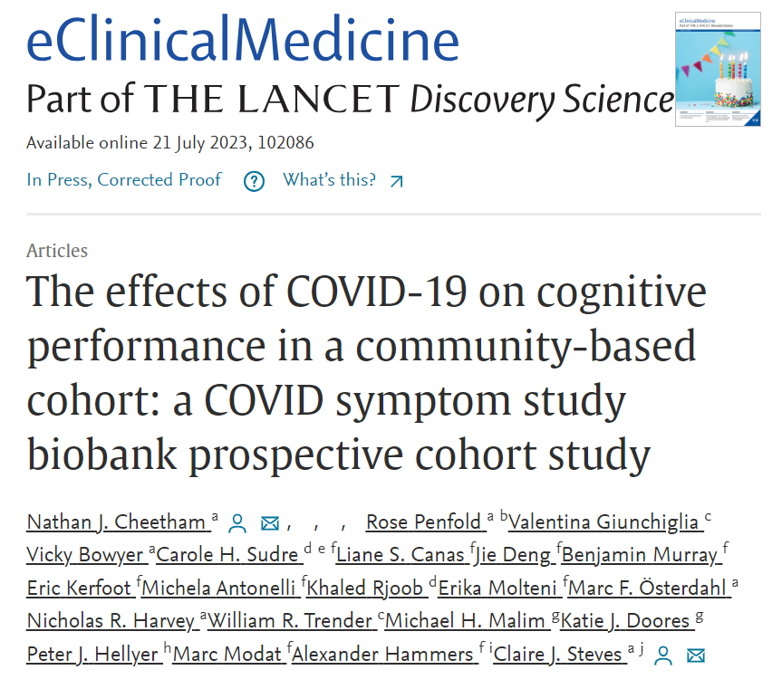 最近,Nathan J. Cheetham等人的一项前瞻性队列研究,发表在EClinicalMedicine题为“The effects of COVID-19 on cognitive performance in a community-based cohort: a COVID symptom study biobank prospective cohort study”,研究发现新冠症状对认知能力有一定影响,且症状持续时间越长,其影响越大。