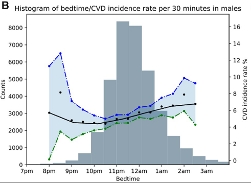 心血管疾病患者中,43%在凌晨及更晚睡,38%在11-12点间睡,而仅有15%在10-11点间睡,4%在10点前睡。