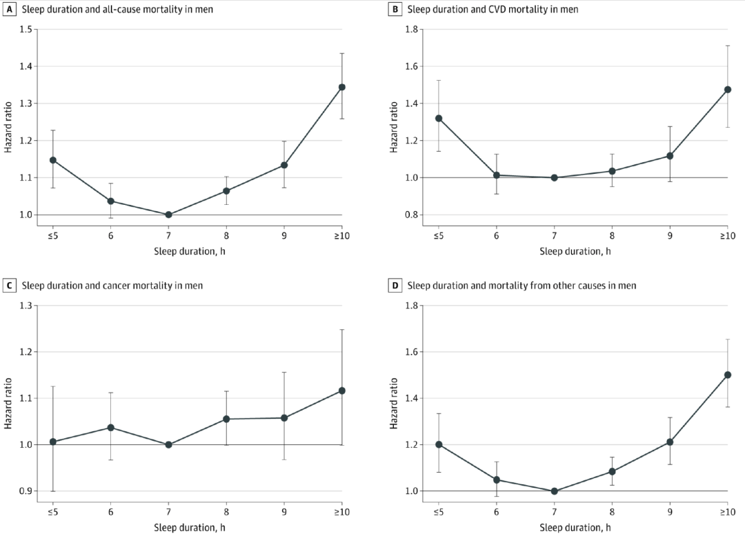 结果显示,睡眠时间与全因死亡率之间存在J型关联——7小时的睡眠时间是与全因、心血管疾病和其他原因死亡相关的最低点。