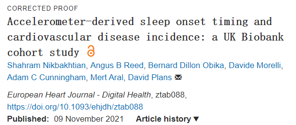 [1] Shahram Nikbakhtian, Angus B Reed, Bernard Dillon Obika, Davide Morelli, Adam C Cunningham, Mert Aral, David Plans, Accelerometer-derive sleep onset timing and cardiovascular disease incidence: a UK Biobank cohort study, European Heart Journal – Digital Health, 2021;, ztab088, https://doi.org/10.1093/ehjdh/ztab088