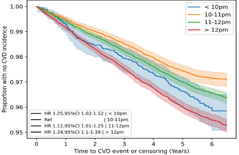 European Heart Journal-Digital Health上刊登的一项队列研究,对英国生物库招募的103,679名参与者进行调查随访,深入探究了入睡时间与心血管疾病风险之间的关系,最终确认了「最佳入睡时间」。