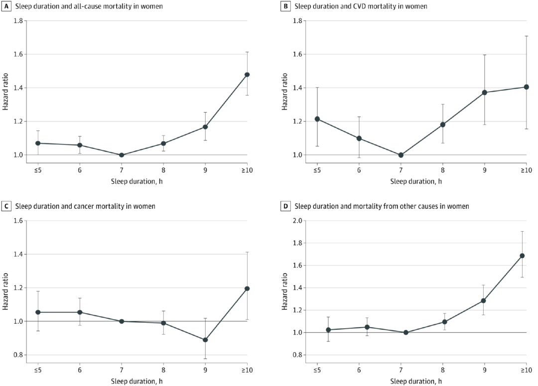 除了全因死亡风险之外,睡眠时间与心血管疾病、癌症以及其他原因导致的死亡风险之间几乎都存在类似的关联,即在7小时时达到最低点。不过,不同性别之间存在一定的差异。