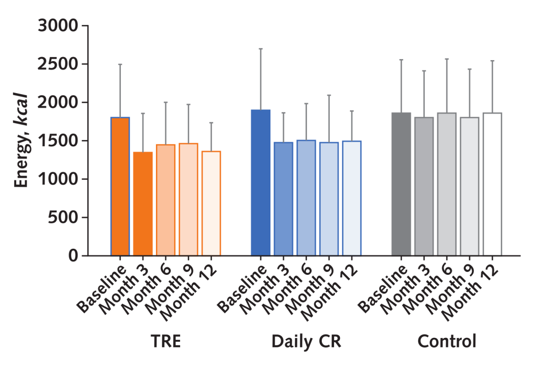 大众的正常认知中,限时进食就是不计算卡路里,“想吃多少吃多少”。但人们往往高估了自己在8小时内能吃的量,实际情况并非如此。本研究中,TRE组的每日能量摄入平均减少了425kcal!甚至超过了CR组每日减少的405kcal。