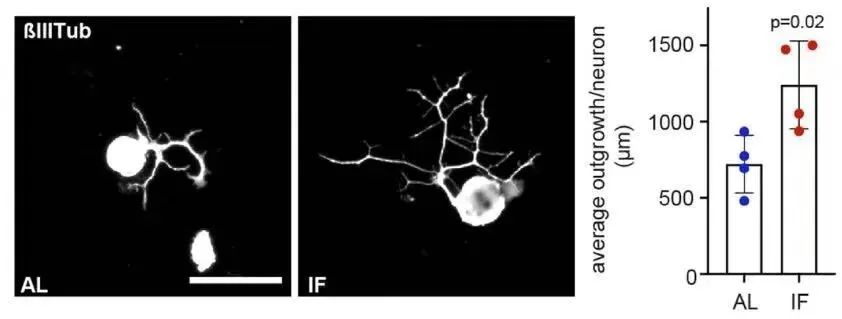 间歇性禁食组(IF,红色)组与对照组(AL,蓝色)脊髓背根节神经元轴突生长情况区别