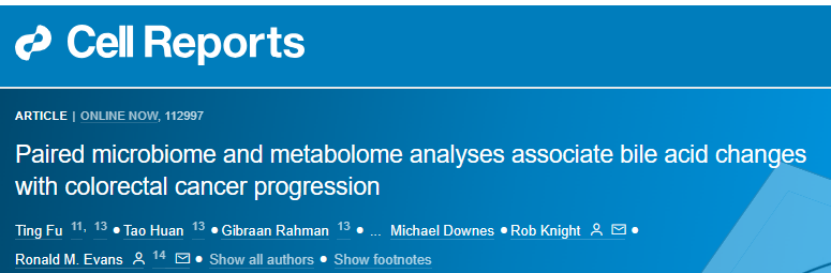 [2] Fu, Ting et al. Paired microbiome and metabolome analyses associate bile acid changes with colorectal cancer progression. Cell Reports. doi:org/10.1016/j.celrep.2023.112997