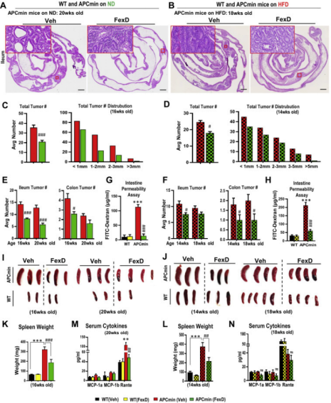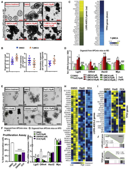 作者观察到FXR受体受到抑制后,肠癌细胞和肠道干细胞的相关标志物的水平也有增加,猜测FXR激活后可能抑制癌症细胞的增殖并采用多种结肠癌细胞进行猜想验证。研究发现FXR的激活剂FexD激活FXR之后,肠道干细胞的分裂增殖节奏恢复,肿瘤的生长被大幅限制。对此,作者开展了动物实验来验证细胞实验结果,发现当给予APCmin/+小鼠FexD后显著延长了小鼠生存时间,且T-βMCA表达水平下降,表明FXR激活可以抵消T-βMCA带来的患癌负面影响。