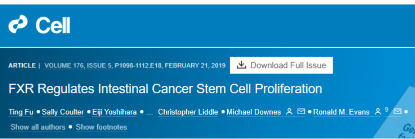 [1] Fu T, Coulter S, Yoshihara E, et al. FXR Regulates Intestinal Cancer Stem Cell Proliferation. Cell. 2019;176(5):1098-1112.e18. doi:10.1016/j.cell.2019.01.036
