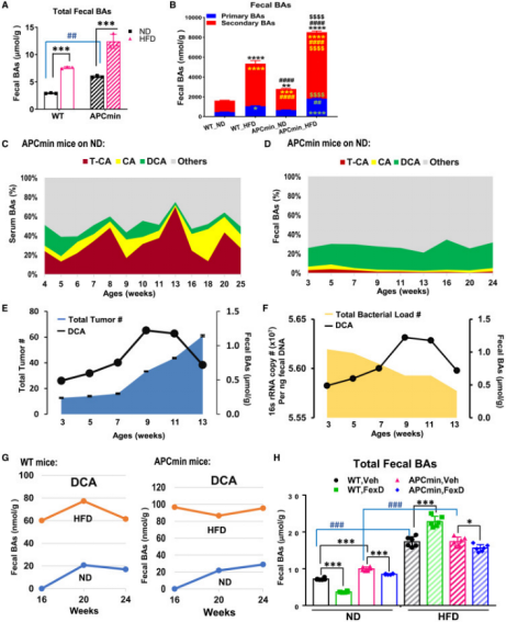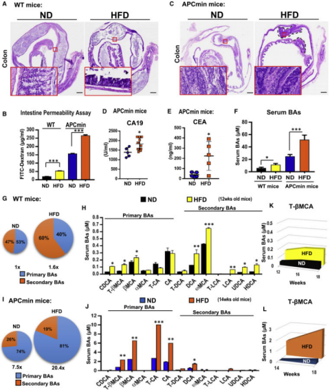 为了解饮食对肿瘤进展的作用,作者探讨了WT小鼠和APCmin/+小鼠喂养正常(ND)饮食或高脂(HFD)饮食后的变化,发现四组小鼠中,经过HFD喂养的APCmin/+小鼠发生的改变最为显著,包括肠腔和邻近组织的增加,小肠和结肠中粪便BA,甘油三酯(TG)和游离脂肪酸(FFA)水平显着增加,肠道形态学发生改变(绒毛长度减少和隐窝变深、内陷,伴随着肠道通透性增加)。此外,CRC恶性肿瘤生物标志物癌胚抗原(CEA)和癌抗原19-9(CA-19)的血清水平显著升高。以上结果表明HFD促进APCmin/+小鼠从腺瘤—腺癌进展的观点。