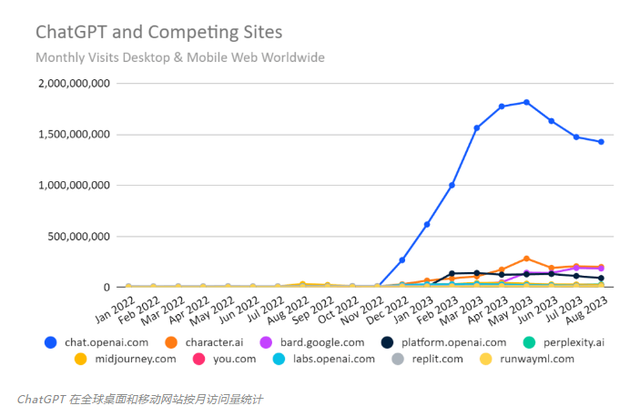 AI公司们纷纷“盯”上了企业大客户。当人们对ChatGPT的热情不再,AI还剩下什么?华尔街见闻此前曾介绍,ChatGPT的网站访问量已连续三个月下降——8月PC和移动端的访问量下降了 3.2%,而此前两个月的访问量均下降了10%。