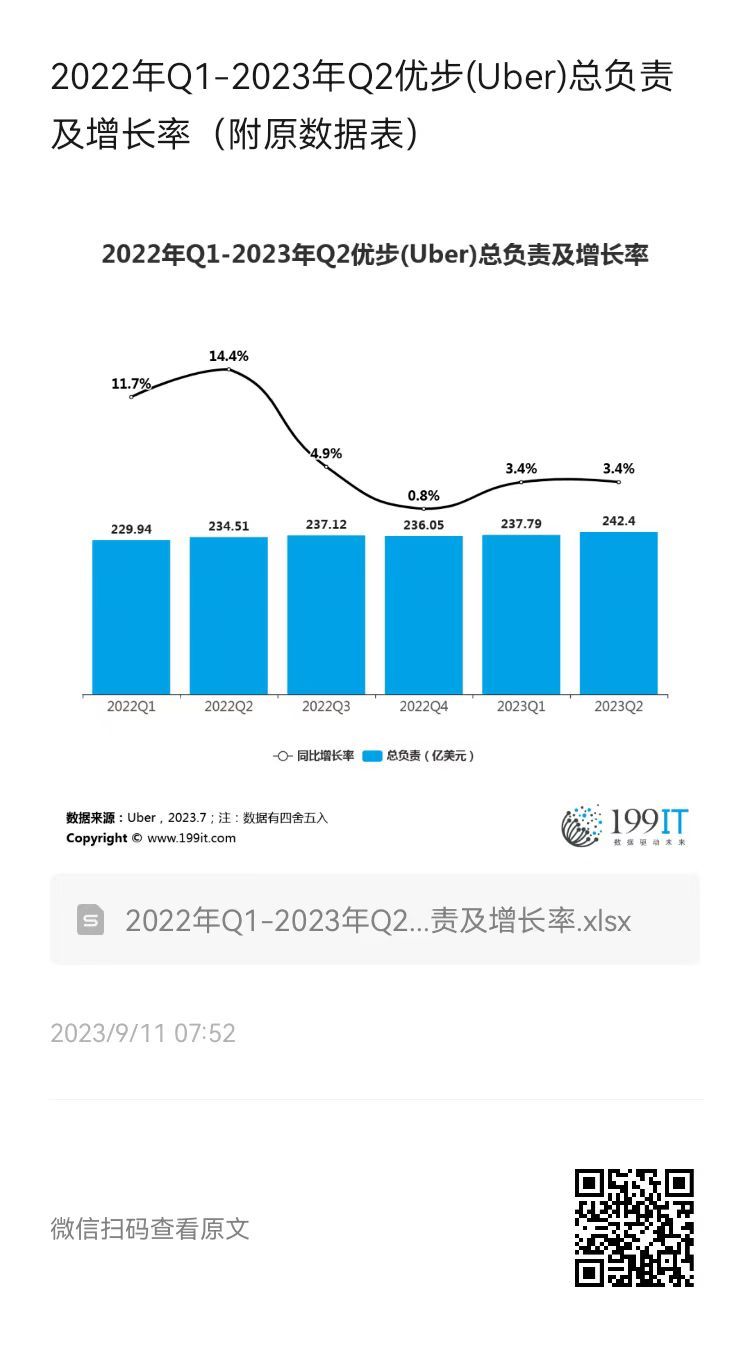 2022年Q1-2023年Q2优步(Uber)总负责及增长率(附原数据表) ​​​