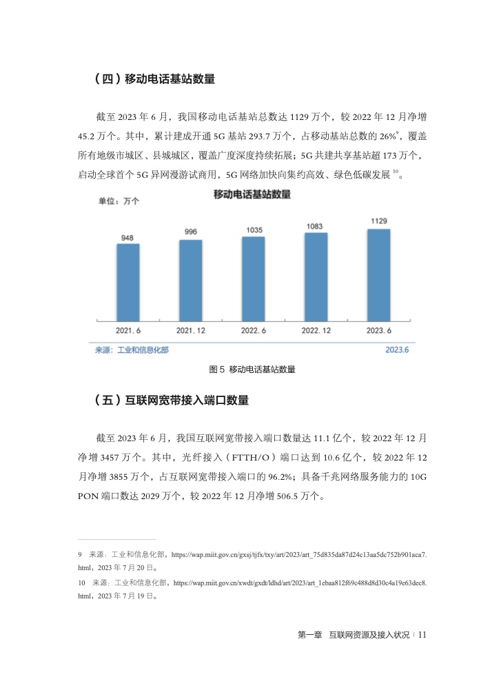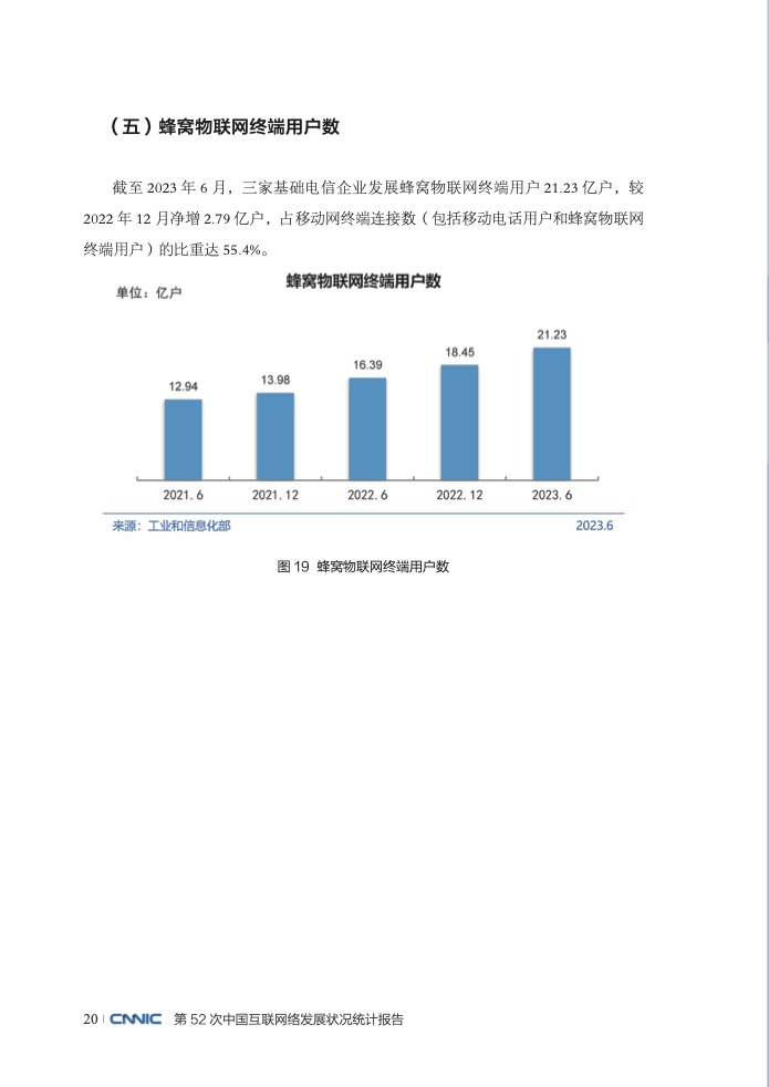 《报告》显示,在网络基础资源方面,截至2023年6月,我国域名总数为3024万个;IPv6地址数量为68055块/32,IPv6活跃用户数达7.67亿;互联网宽带接入端口数量达11.1亿个;光缆线路总长度达6196万公里。在移动网络发展方面,截至6月,我国移动电话基站总数达1129万个,其中累计建成开通5G基站293.7万个,占移动基站总数的26%;移动互联网累计流量达1423亿GB,同比增长14.6%;移动互联网应用蓬勃发展,国内市场上监测到的活跃APP数量达260万款,进一步覆盖网民日常学习、工作、生活。在物联网发展方面,截至6月,三家基础电信企业发展蜂窝物联网终端用户21.23亿户,较2022年12月净增2.79亿户,占移动网终端连接数的比重为55.4%,万物互联基础不断夯实。