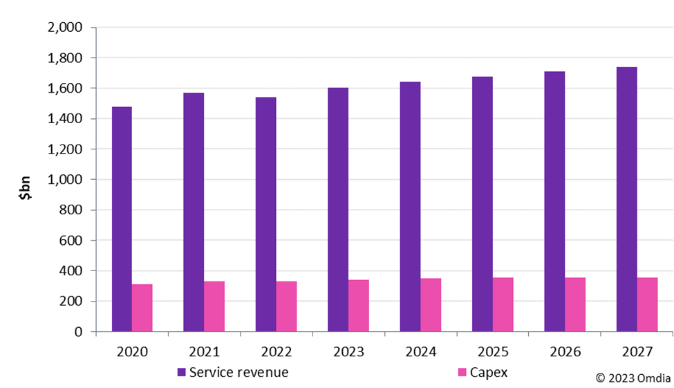 Figure 1: Telco service revenue and capex, 2020–27