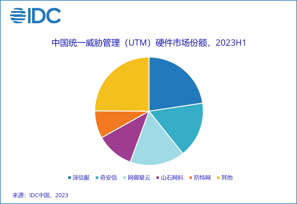IDC定义下的网络安全硬件市场分别由统一威胁管理 (UTM)、基于UTM平台的防火墙 (UTM Firewall) 、安全内容管理(SCM)、入侵检测与防御 (IDP)、虚拟专用网(VPN)和传统防火墙 (Traditional Firewall) 构成。
