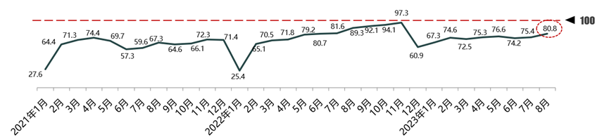2023年9月4日,中国汽车流通协会发布最新一期“汽车消费指数”:2023年8月份汽车消费指数为80.8,高于上月。