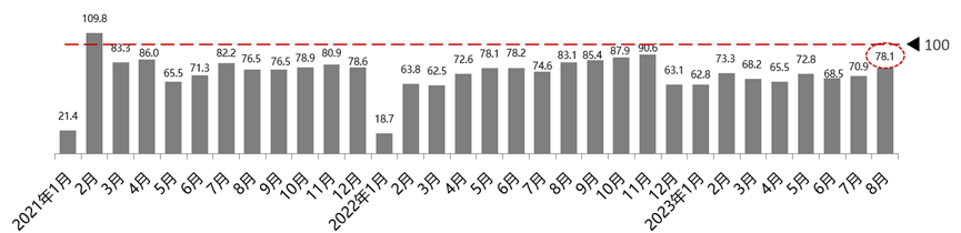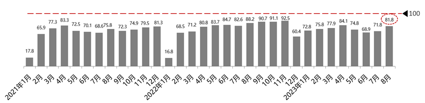 2023年8月入店分指数为81.8,高于上月,预期9月消费者入店购车人数会有所提升。9月,学生已经开学,出门旅游的人员减少,有购车需求的客户将准备购车。同时9月天气秋高气爽,有利于入店购车人数的增加。