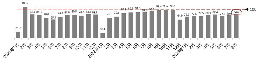 2023年8月购买分指数为84.6,高于上月,预期2023年9月汽车购买情况会有所好转。随着汽车销售旺季的到来和客户购车需求的提升,汽车销量将实现季节性的增长,当月的汽车销售情况将向好转变。