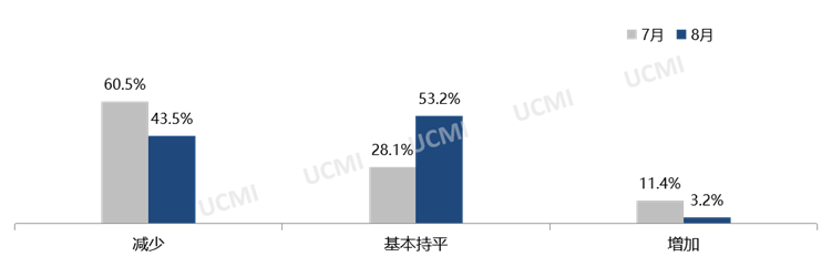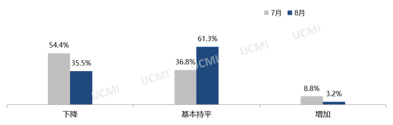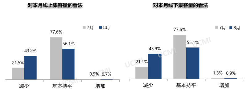 调查显示,8月份线上集客量与线下集客量均有所减少,其中认为线上集客量“减少”的二手车经理人比例为43.2%;认为线下集客量“减少”的二手车经理人比例为43.9%。