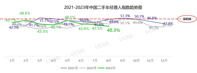 2023年9月4日,中国汽车流通协会发布最新一期“中国二手车经理人指数”(UCMI)。本期UCMI结果显示,8月份二手车经理人指数为40.3%,相比7月份下降2.2个百分点,仍处于荣枯线之下,二手车市场表现不活跃。