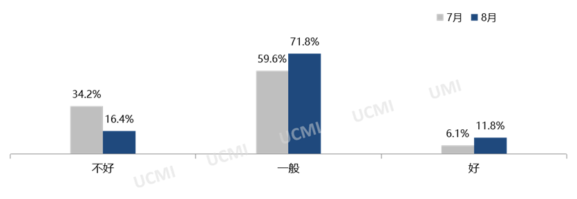 总体来看,8月份的二手车经理人指数低于7月份,仍处于荣枯线以下。主要是受极端天气以及新车市场持续降价的因素影响。8月份的市场集客和成交情况均明显下降,二手车商经营状况一般。