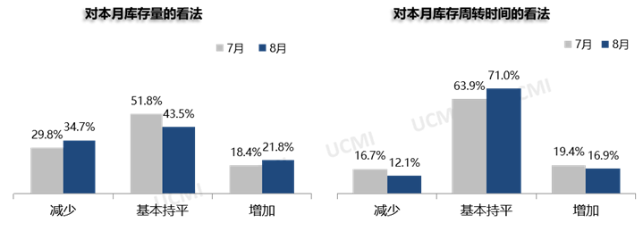 调查显示,8月份库存量有所减少、库存周转时间基本持平。其中认为库存量“减少”的二手车经理人比例为34.7% ;认为库存周转时间“持平”的二手车经理人比例为71.0%。