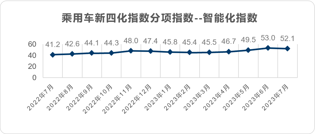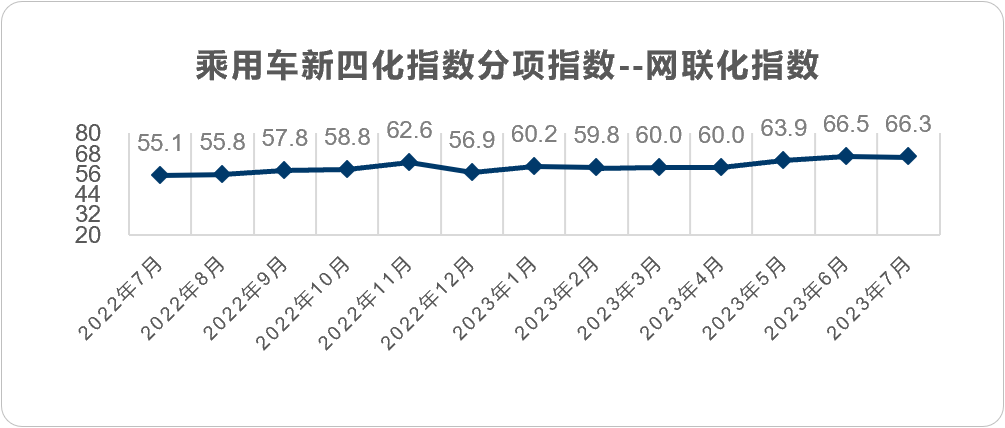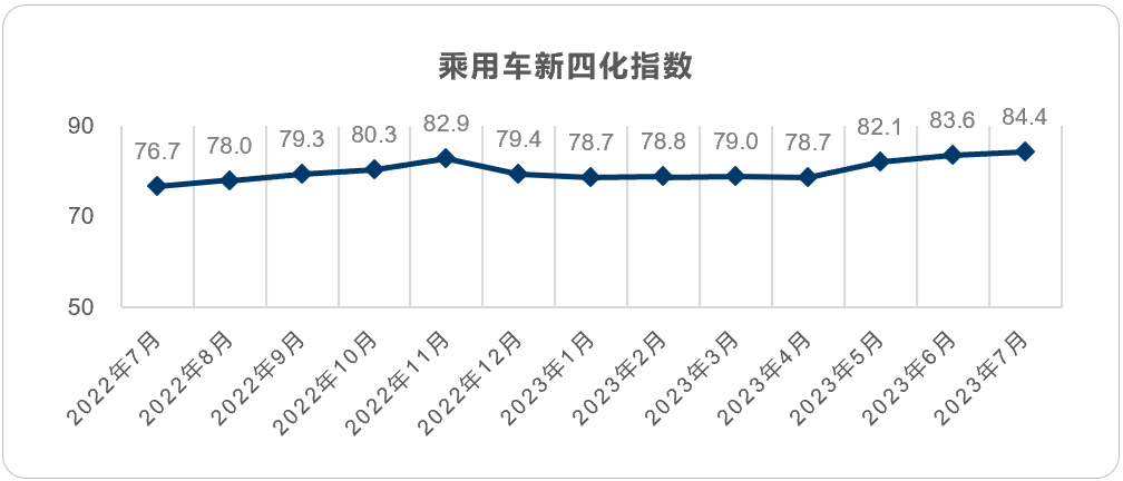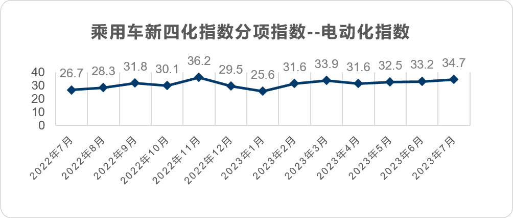 乘联会&安路勤: 2023年7月乘用车新四化指数为84.4 中国汽车流通协会汽车市场研究分会(乘用车市场信息联席会,简称乘联会)联合上海安路勤企业管理咨询有限公司(简称安路勤)联合发布的乘用车新四化指数,旨在定期监控国产乘用车市场的新四化发展进程,并通过历史数据比对,判断未来发展趋势。 2023年7月乘用车新四化指数为84.4。其中电动化指数为34.7;智能化指数为52.1;网联化指数为66.3。 通过对2022年7月起的乘用车新四化指数进行追溯计算,可以看到最近13个月来的乘用车新四化指数走势变化。 目前,乘用车新四化指数有三个分项指数,分别为电动化指数、智能化指数和网联化指数。 2023年7月电动化指数为34.7,继续保持上升态势。 2023年7月智能化指数为52.1,较上月有小幅回落。 2023年7月网联化指数为66.3,与上月基本持平。 2023年7月乘用车市场零售为177.5万辆,环比下降6.3%,其中新能源乘用车市场零售销量64.1万辆,环比下降3.6%。 7月整体乘用车市场销量较6月小幅收窄,虽然新能源市场零售销量也同时出现了环比下降,但降幅小于整体市场,因而也推动本月的电动化指数仍然向上攀升;同时,受特斯拉Model Y和Model 3、比亚迪宋Pro等几款权重车型7月销量出现较大幅度缩减的影响,本月智能化指数和网联化指数没有延续前几个月快速攀升的趋势,整体与上月基本持平,并未出现明细变化。 说明:随着新四化市场的快速发展,为了更好的用新四化指数衡量发展进程,我们将根据各指数的特点设定中期发展目标。当某个指数达到中期发展目标时,我们将提高此指数的衡量标准。不断完善新四化指数对于市场动态监测体系。 更多阅读:乘联会&安路勤:2019年12月乘用车新四化指数为53.8乘联会&安路勤:2021年12月乘用车新四化指数为69.4乘联会&安路勤:2022年1月乘用车新四化指数为64.3乘联会&安路勤:2023年1月乘用车新四化指数为78.7乘联会&安路勤:2021年12月乘用车新四化指数为69.4乘联会&安路勤:2022年7月乘用车新四化指数为76.7乘联会&安路勤:2023年3月乘用车新四化指数为79.0乘联会&安路勤:2021年5月乘用车新四化指数为66.2乘联会&安路勤:2021年6月乘用车新四化指数为65.8乘联会&安路勤:2021年1月乘用车新四化指数为65.3乘联会&安路勤:2021年4月乘用车新四化指数为66.1乘联会&安路勤:2020年6月乘用车新四化指数为53.9乘联会&安路勤:2020年5月乘用车新四化指数为53.2乘联会&安路勤:2020年4月乘用车新四化指数为53.8乘联会&安路勤:2022年5月乘用车新四化指数为73.0