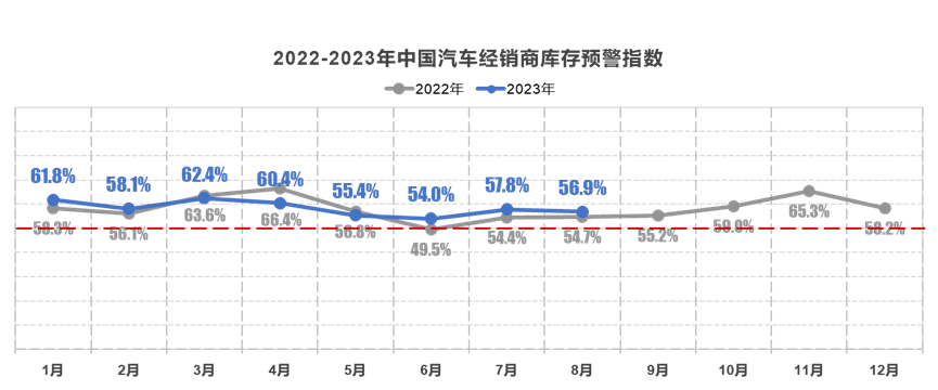 2023年8月31日,中国汽车流通协会发布的最新一期“中国汽车经销商库存预警指数调查”VIA(Vehicle Inventory Alert Index)显示,2023年8月中国汽车经销商库存预警指数为56.9%,同比上升2.2个百分点,环比下降0.9个百分点,库存预警指数位于荣枯线之上,汽车流通行业处在不景气区间。